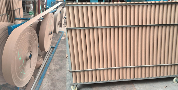 這個紙管成型的一個過程,借助于卷管機(jī)把原本分切好的紙幾張粘合而形成一個紙筒。不同規(guī)格直徑的紙筒需要用到不同寬度的紙。不同厚度的紙筒也分不同層次的紙張,下圖為卷管紙前而紙管形成后。