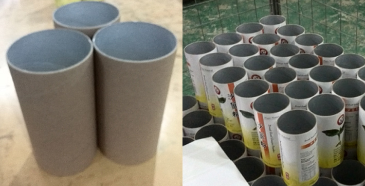 紙管分切完以后,需要把印刷好的銅板紙商標(biāo)貼于紙筒上。這是一個純手工的活兒,需要查膠水與人手粘貼。下圖為紙管貼紙前與貼紙后